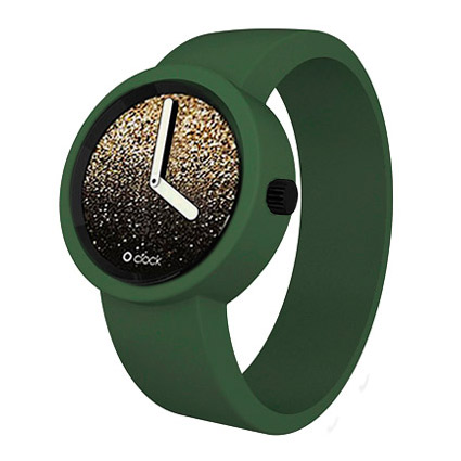 Schwarz mit glitzerndem Zifferblatt von Schwarz bis Gold. Armband: Dunkelgrün.